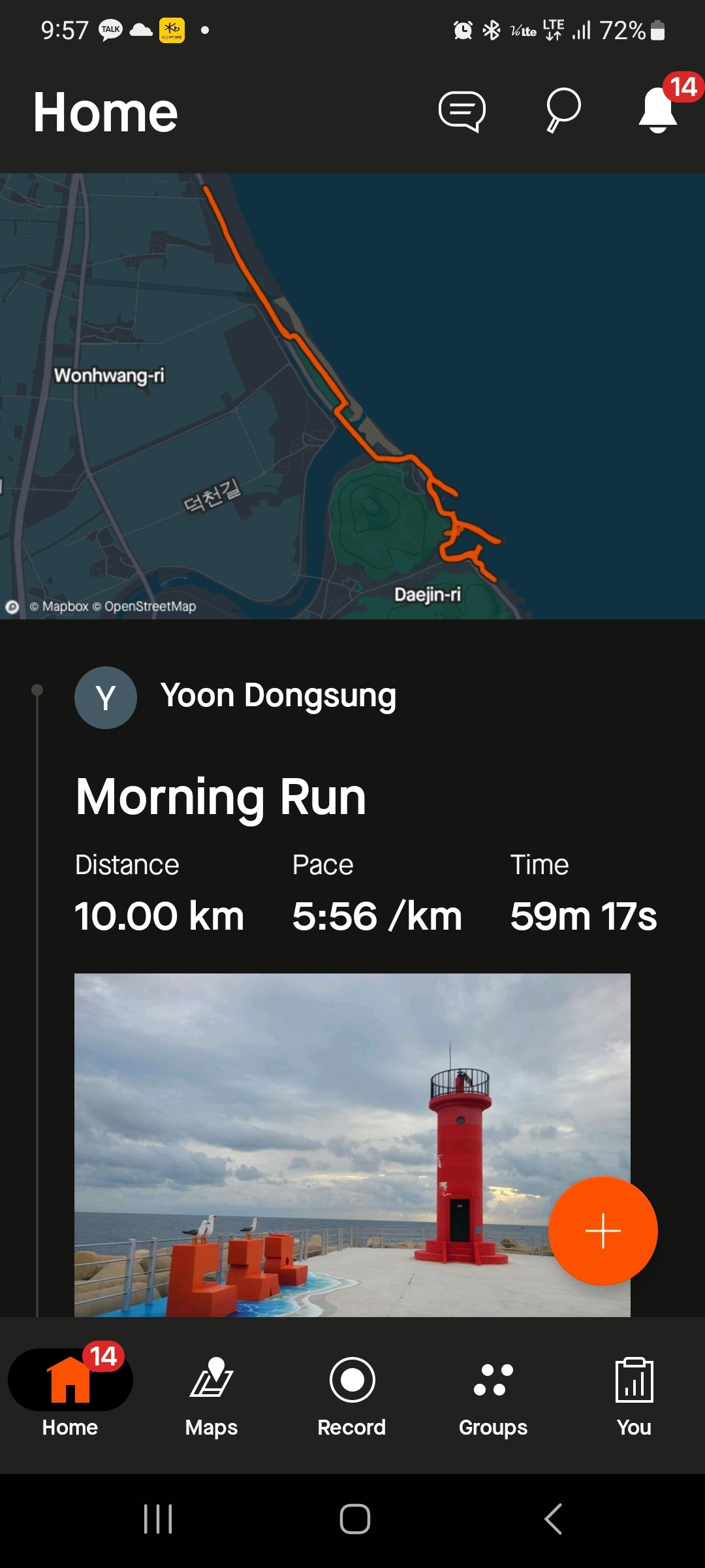 바닷가를 따라 쭉 달려본다. 10km를 달릴 계획이니, 달리기 어플이 5km를 알려주면 돌아가면 된다.